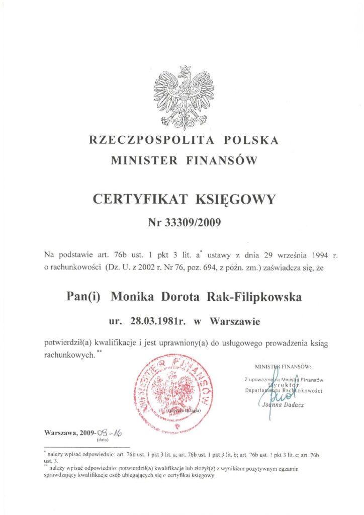 Od wielu lat wspieram przedsiębiorców jako Samodzielna Księgowa. Moje kompetencje potwierdzają kierunkowe wykształcenie oraz Certyfikat Ministerstwa Finansów nr 33309/2009. Specjalistyczną wiedzę łączę z praktycznym doświadczeniem, oferując kompleksowe i rzetelne usługi księgowe dopasowane do potrzeb Twojego biznesu.